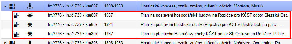- Uživatel založí záznam – jednotlivost v kategorii Kroniky a pod ním záznam – část jednotlivosti v kategorii Fotografie, protože kronika obsahuje fotografii, která je svým obsahem hodna zvláštní pozornosti. K záznamu v kategorii Kroniky připojí zdigitalizovanou podobu celé kroniky, k záznamu v kategorii Fotografie připojí detail fotografie.